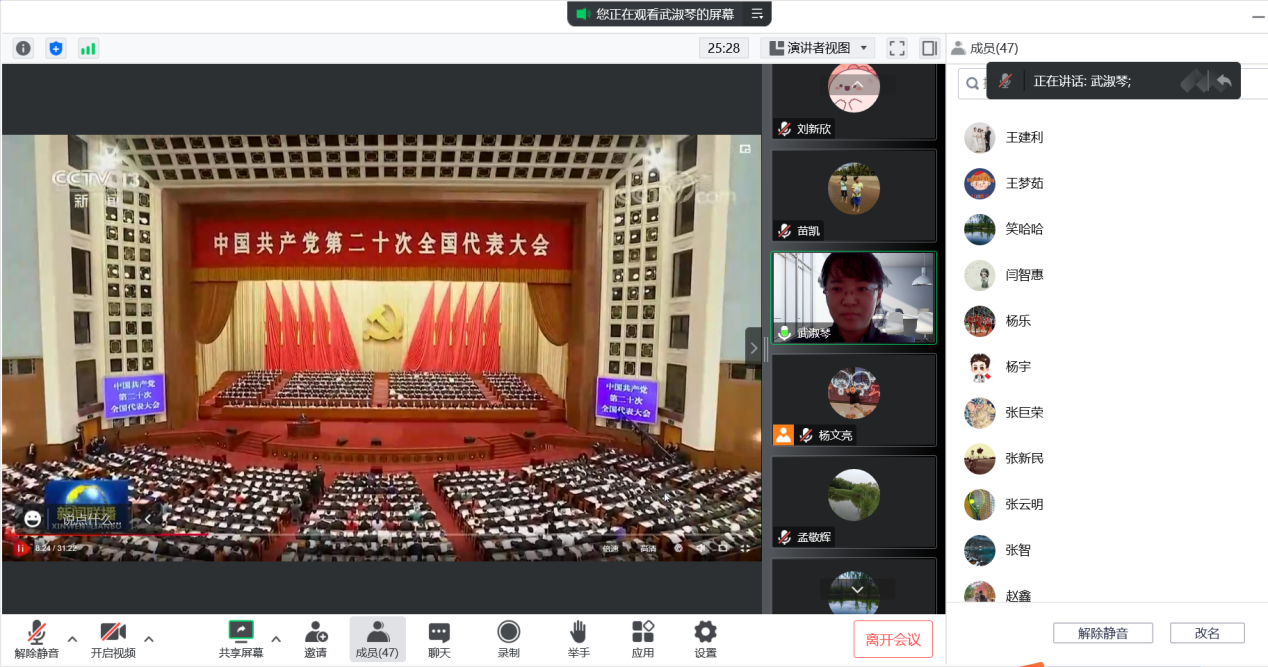 会议第二项,开展集中学习。与会人员通过视频共同学习了《习近平:高举中国特色社会主义伟大旗帜 为全面建设社会主义现代化国家而团结奋斗——在中国共产党第二十次全国代表大会上的报告》。