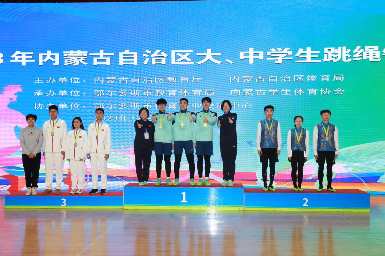 2023年内蒙古自治区大、中学生跳绳锦标赛于12月7日至8日在鄂尔多斯市成功举办。在本次比赛中,bat365官网共派出12名运动员参加个人及团体赛,在17个项目中斩获6项第一名、3项第二名、3项第三名,并且获得2023年内蒙古自治区大学本科组团体总分第三名的优异成绩。值得一提的是,bat365官网包揽了团体规定赛的三个项目冠军,其中《个人绳内蒙古大众规定套路》在赛场上一经亮相,火爆全网,网友纷纷高呼:建议全国推广!