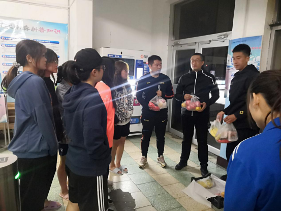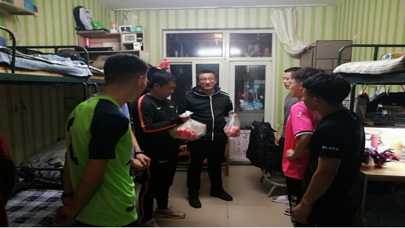庆祝国庆,欢度中秋。2020年9月30日,体育教学部(足球学院)副主任(副院长)苗凯、体育教育系主任王丰、团总支书记闫智惠、2019级班主任杨乐等人到体育教育专业学生宿舍开展“送关爱,送温暖”中秋国庆节日慰问活动。