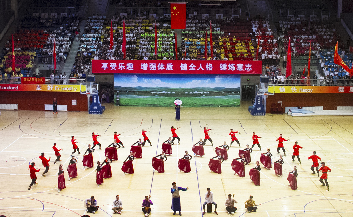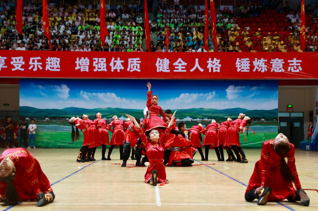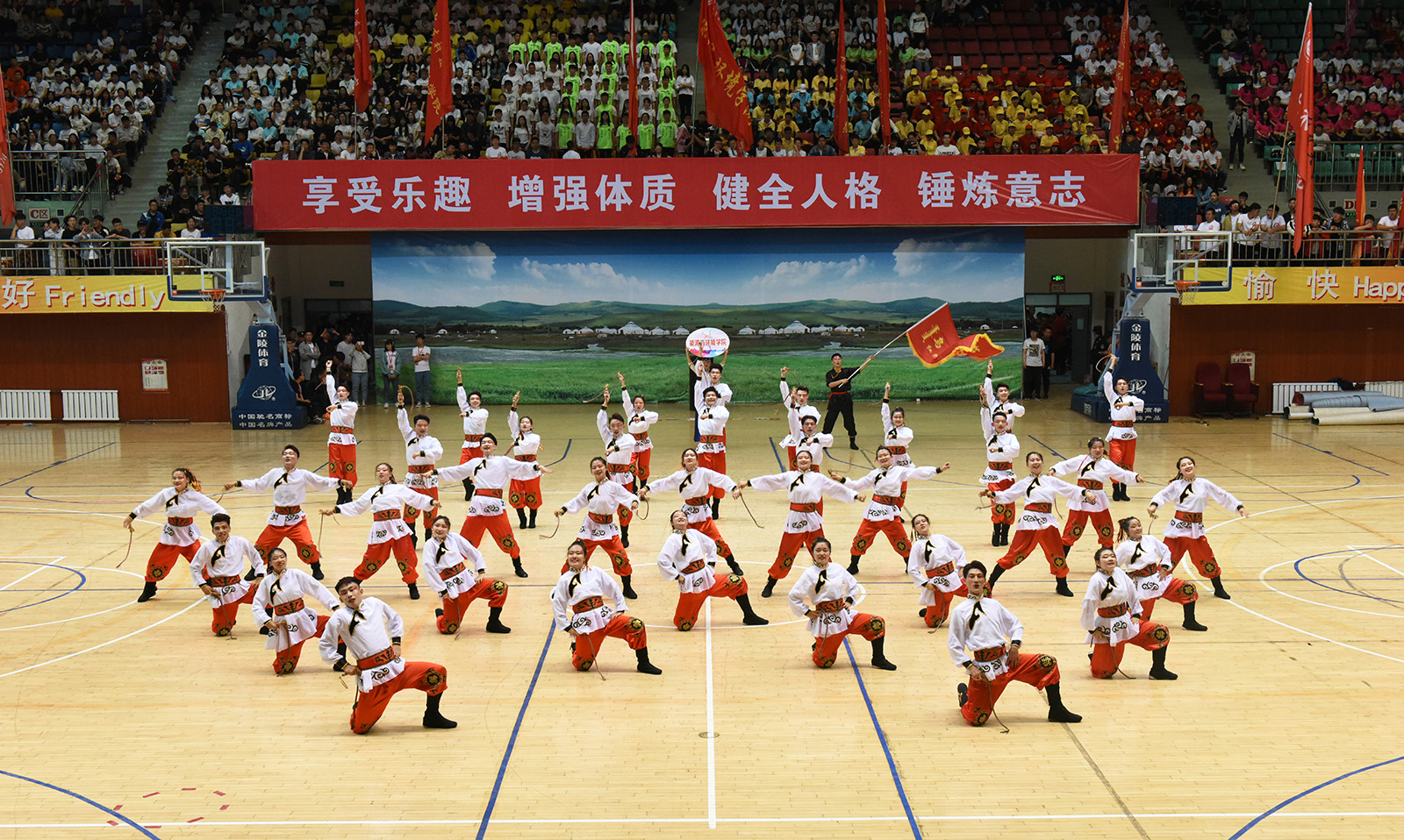 比赛在激昂的开场舞中拉开序幕,参赛队伍及裁判员依次入场。雄壮的国歌声响起,全场起立,面向国旗行注目礼。安胜利致开幕词。他表示,入场仪式振奋人心、富有创意、具有浓厚的民族特色。学校的健身操舞比赛至今已举办五届,感谢大家的积极参与,感谢主办单位辛勤指导和各学院精心筹备,预祝本次比赛圆满成功,各代表队取得优异成绩。运动员、裁判员宣誓后,比赛正式开始。