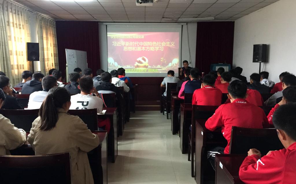 为贯彻落实党的十九大精神,深刻领会习近平新时代中国特色社会主义思想和基本方略,切实提高广大青年党员、团员的政治素养, 9月14日上午8:30,体育教学部(足球学院)党总支书记、院长田瑞峰在体育馆二楼多媒体教室作了关于“习近平新时代中国特色社会主义思想和基本方略”的专题学习讲座,体育教育专业(足球方向)学生认真聆听,积极学习。