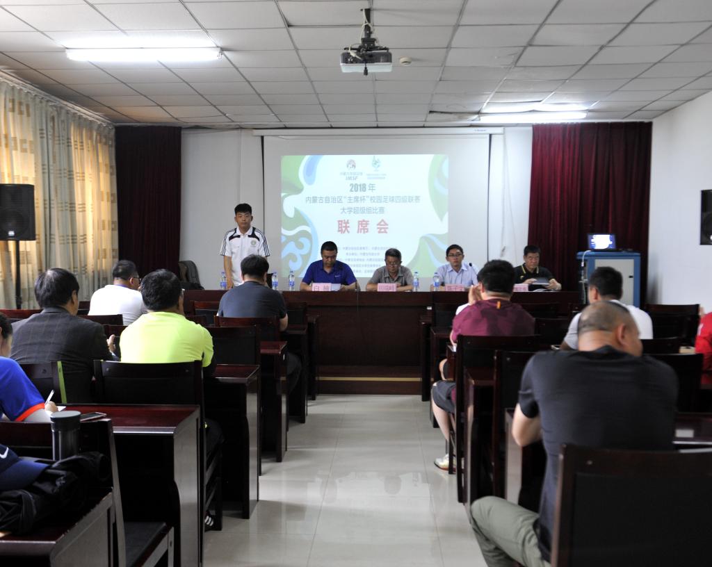 6月1日下午16:00,2018年内蒙古自治区“主席杯”校园足球四级联赛大学生超级组领队、教练员、裁判员联席会在内科大体育馆二楼会议室举行。内蒙古校园足球联合会秘书长、bat365正版唯一官网体育教学部(足球学院)主任田瑞峰,内蒙古校园足球办公室竞赛负责人陈子文,比赛监督孙志华、裁判长贺春亮参加会议。联席会由bat365正版唯一官网体育教学部(足球学院)副主任白楠主持。