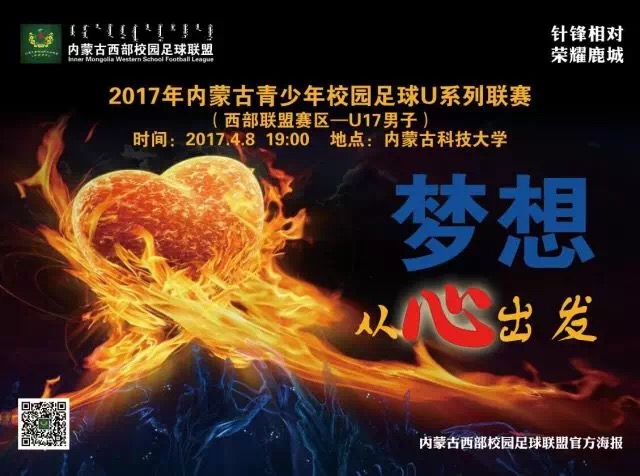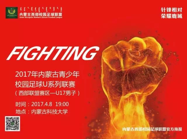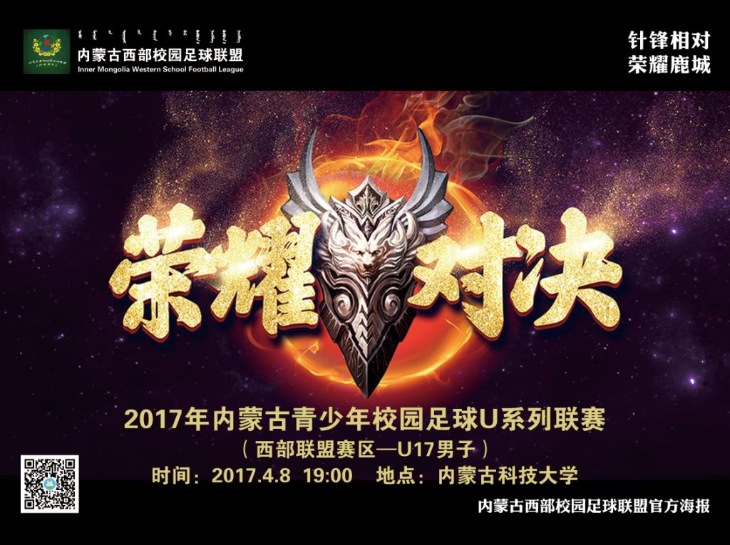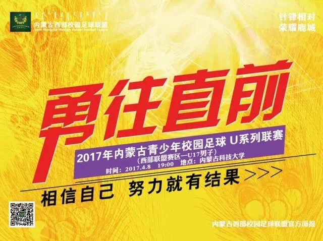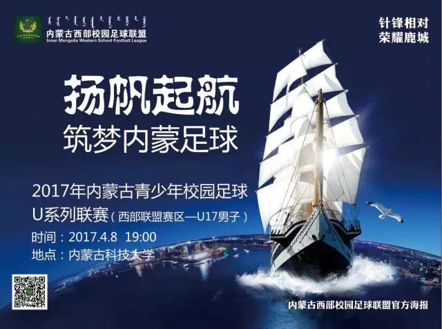 4月8日19:00分,2017年内蒙古自治区校园足球“西部联盟杯”校园足球联赛(U17男子组)揭幕战将在bat365正版唯一官网主校区体育场举行,对阵双方由包头市主场迎战巴彦淖尔市。本次比赛由内蒙古自治区校园足球工作领导小组办公室主办,内蒙古西部校园足球联盟、包头市教育局、乌海市教育局、巴彦淖尔市教育局、阿拉善盟教体局承办,内蒙古自治区中学生体育协会、内蒙古校园足球联合会协办。