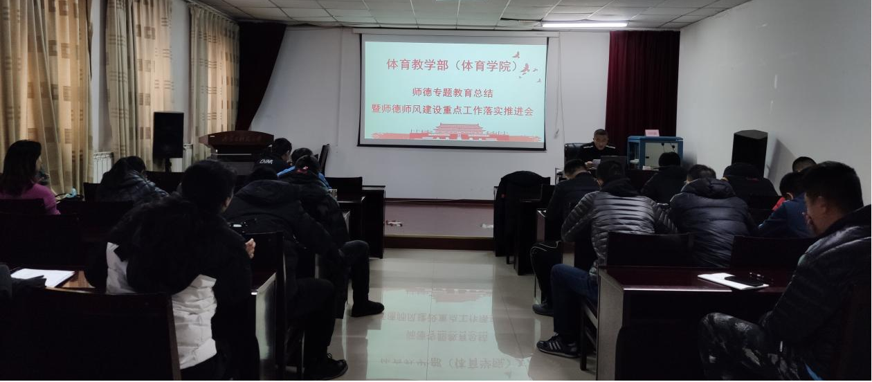 2021年11月18日,bat365正版唯一官网在体育馆多媒体教室召开师德专题教育总结暨师德师风建设重点工作落实推进会,学院党总支书记苗凯主持会议,全体教职工参加会议。