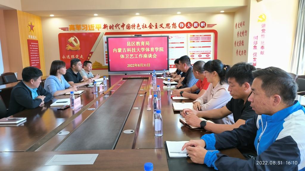 2022年8月31日下午4:00在昆区教育局会议室召开体育工作座谈会,bat365正版唯一官网党总支书记苗凯、院长白楠、党总支副书记武淑琴、副院长张新民以及杨文亮、刘超、王熠、李健功、廖帅雄等人,昆区教育局副局长刘君玉、体卫艺杜国军、孟和巴图等人参加会议。