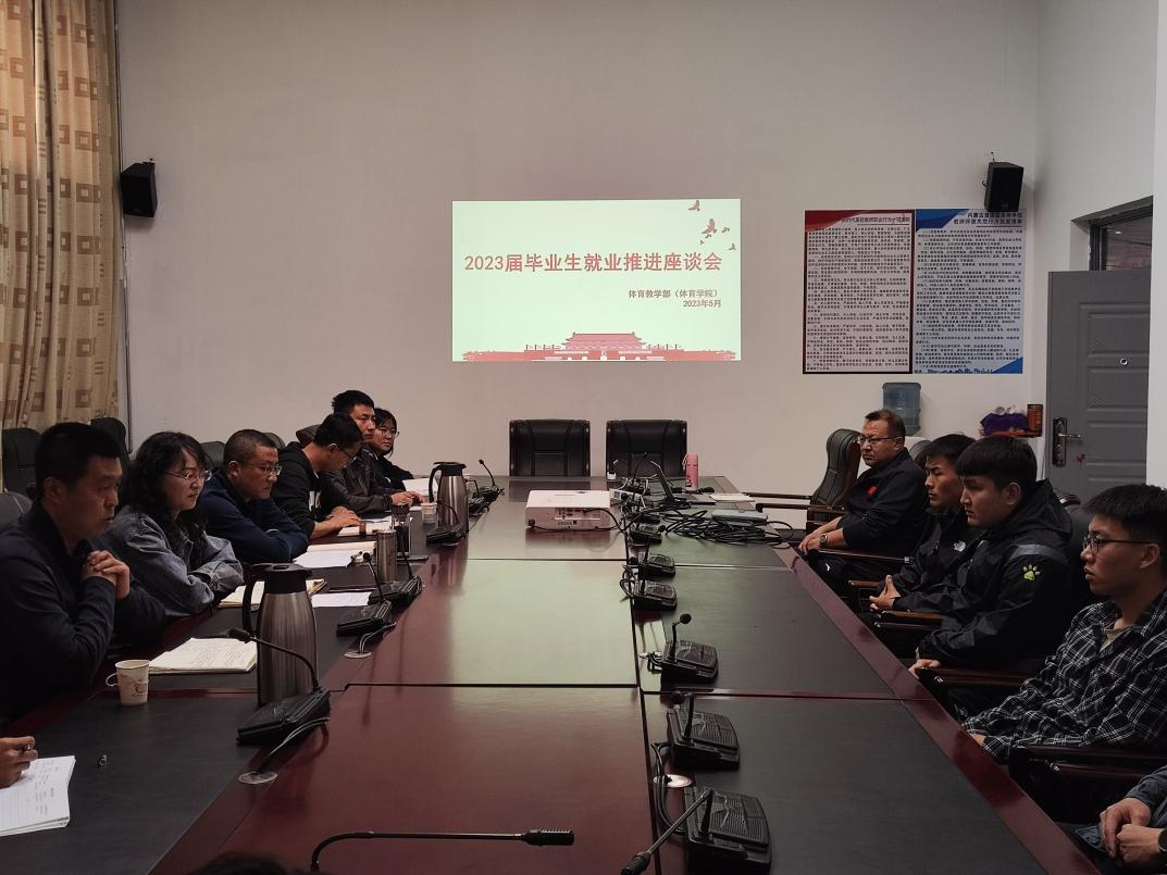 2023年5月5日,bat365正版唯一官网在体育馆二楼会议室组织召开2023届毕业生就业推进座谈会,bat365正版唯一官网党委书记苗凯、院长白楠、党委副书记武淑琴、副院长张新民、学工办主任杨乐、团总支负责人王梦茹,招生就业处职业发展与就业指导中心主任高玉峰、就业信息中心王宇、就业信息中心贺凌飞以及2023届体育教育专业毕业生参加座谈会。