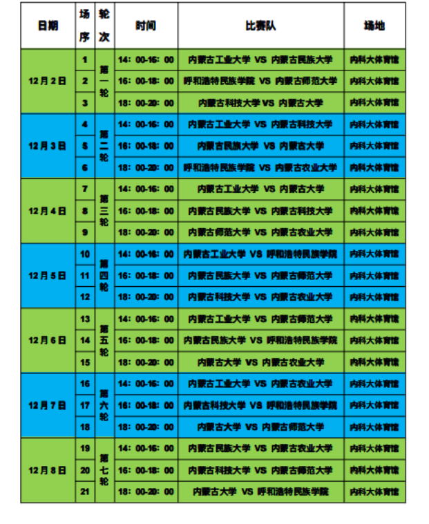 本轮首场比赛由内蒙古工业大学队对战内蒙古民族大学队,内蒙古民族大学队以比分5比2获胜。