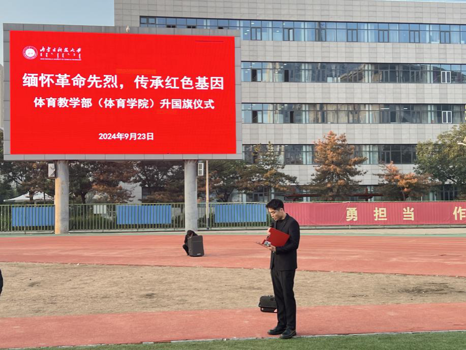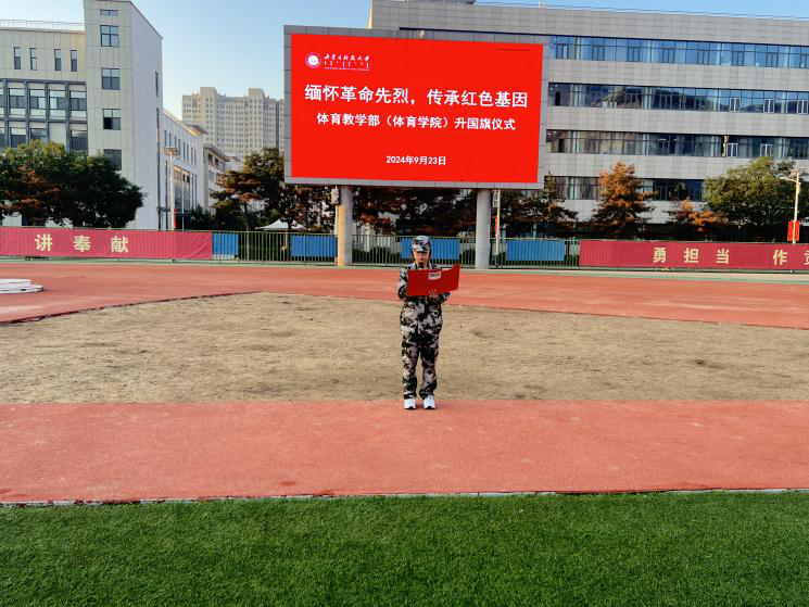 2024 年 9 月 23 日,bat365正版唯一官网举行“缅怀革命先烈,传承红色基因”升国旗仪式,学院党委书记韩冰、院长白楠、党委副书记唐国桥、副院长张新民、副院长杜晓炜、师生党员、体育教育专业全体学生参加升旗仪式。升旗仪式由体育教育2023-1班张翊主持。