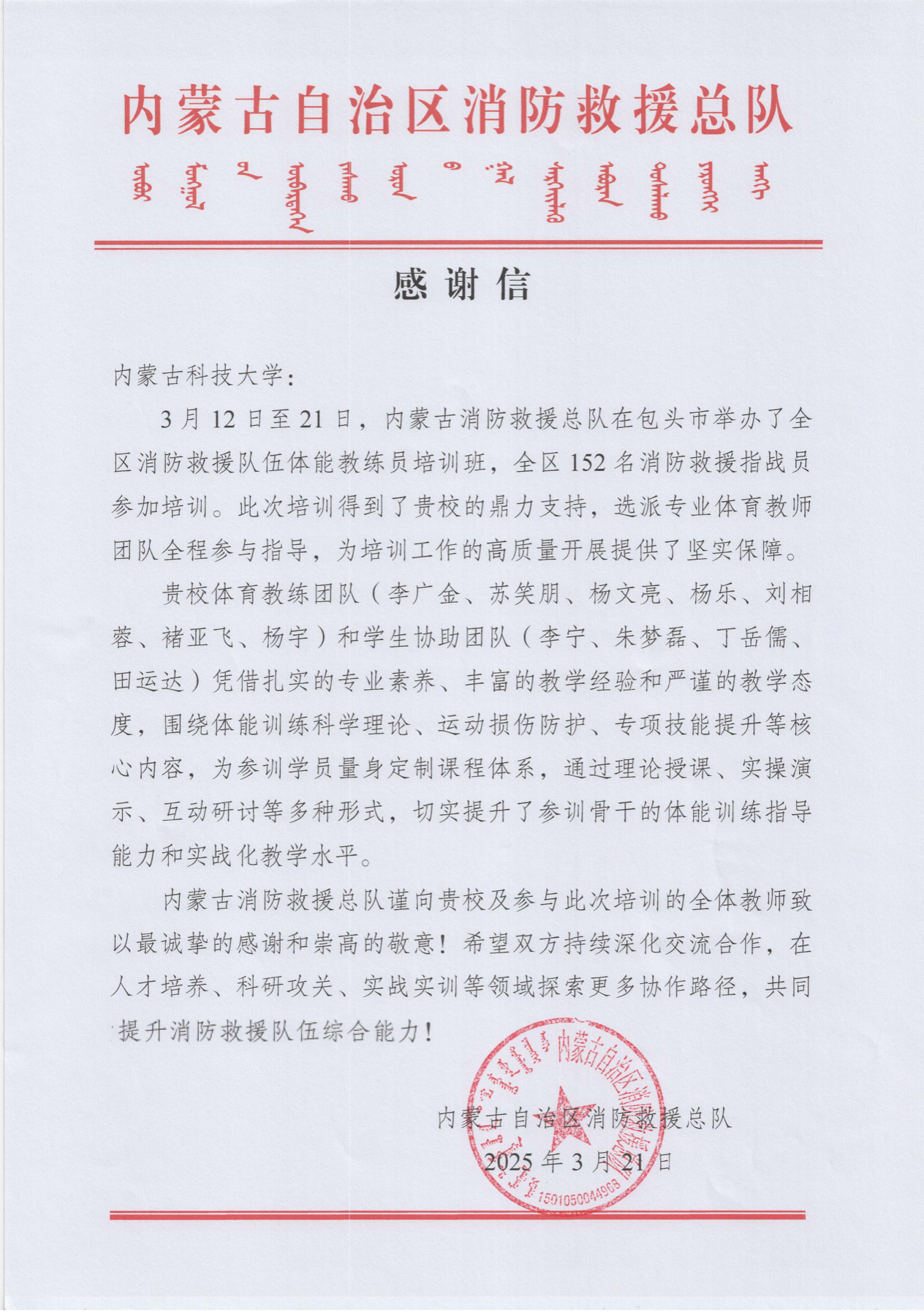 近日,学校收到内蒙古自治区消防救援总队发来的感谢信,对学校在全区消防救援队伍体能教练员培训班中的支持和指导给予感谢。信中提到“体育教练团队(李广金、苏笑朋、杨文亮、杨乐、刘相蓉、褚亚飞、杨宇)和学生协助团队(李宁、朱梦磊、丁岳儒、田运达)凭借扎实的专业素养、丰富的教学经验和严谨的教学态度,围绕体能训练科学理论、运动损伤防护、专项技能提升等核心内容,为参训学员量身定制课程体系,通过理论授课、实操演示、互动研讨等多种形式,切实提升了参训骨干的体能训练指导能力和实战化教学水平”,并希望双方持续深化交流合作。